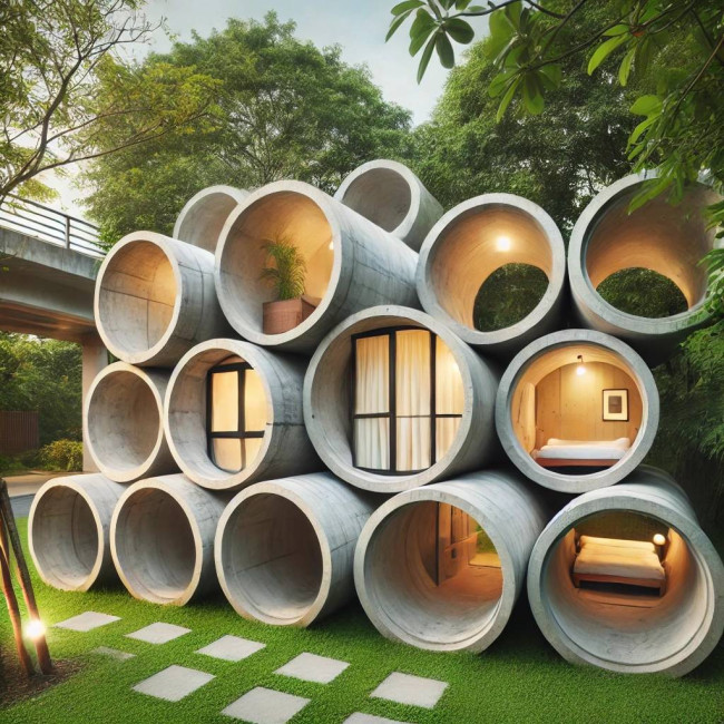 涵管屋的主要建材是預製鋼筋混凝土管,這些管材通常可以大規模生產,生產成本較低。與傳統建築所需的各種建材(如鋼筋、砂石、水泥、磚塊等)相比,涵管屋的建材相對簡單且容易取得,從而節省了大量的建材費用。