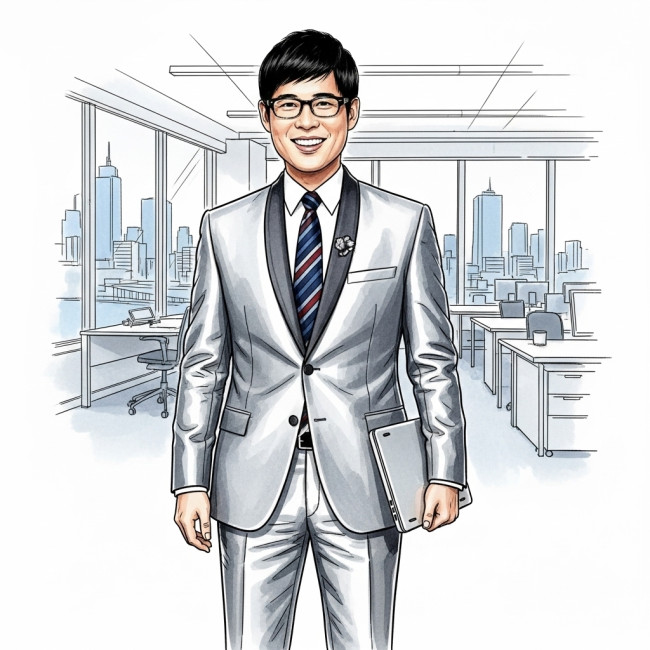 「依照所提供照片轉換為彩色鉛筆速寫插畫。主角是一位年輕男性,穿著筆挺西裝,戴黑框眼鏡,手拿筆電坐在辦公桌旁,以側臉特寫描繪。光線由一側打入,黃橙色鉛筆強調亮面,藍綠線條堆疊陰影,形成強烈冷暖對比。筆觸快速自由、充滿能量,部分留白突顯紙張紋理。氛圍既沉靜又富張力,帶有藝術速寫的未完成美感。」