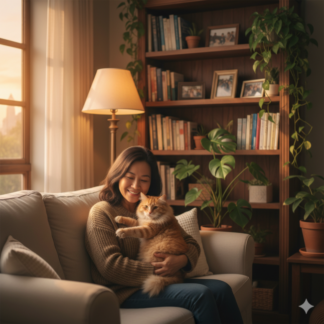 幫我生成一張圖片,真實的圖片,高畫質「一位有愛心的台灣女性,懷抱著一隻可愛的橘貓,坐在溫暖燈光的客廳沙發上,窗外灑落柔和夕陽光線,背景擺放著綠植與書架,呈現溫馨家庭氛圍,高質感寫實風格。」